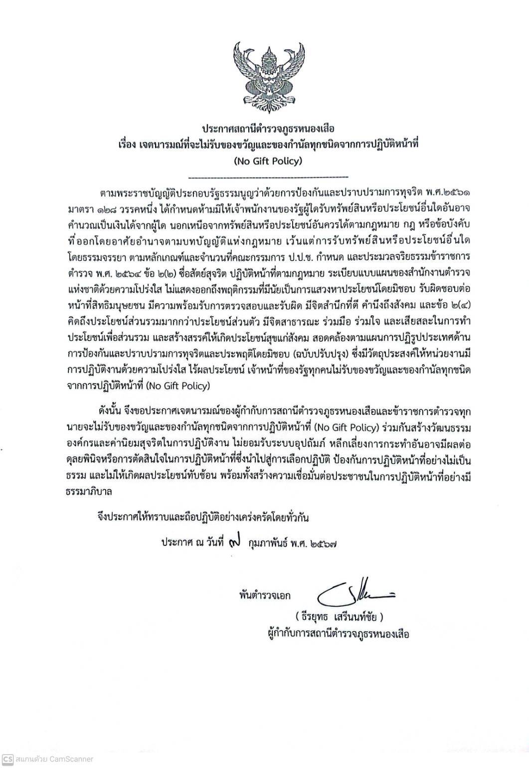 สถานีตำรวจภูธรหนองเสือ เรื่อง เจตนารมณ์ที่จะไม่รับของขวัญและของกำนัลทุกชนิดจากการปฏิบัติหน้าที่ (No Gift Policy)