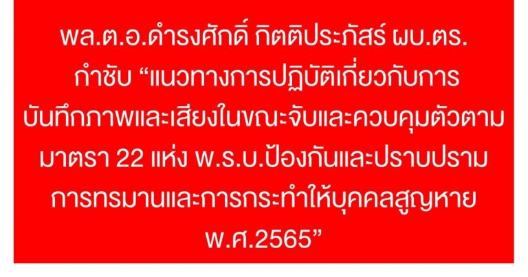 พล.ต.อ.ดำรงศักดิ์ กิตติประภัสร์ ผบ.ตร. กำชับ “แนวทางการ … อ่านเพิ่มเติม พล.ต.อ.ดำรงศักดิ์ กิตติประภัสร์ ผบ.ตร. กำชับ “แนวทางการปฏิบัติเกี่ยวกับการบันทึกภาพและเสียงในขณะจับและควบคุมตัวตามมาตรา 22 แห่ง พ.ร.บ.ป้องกันและปราบปรามการทรมานและการกระทำให้บุคคลสูญหาย พ.ศ.2565”