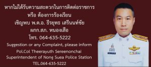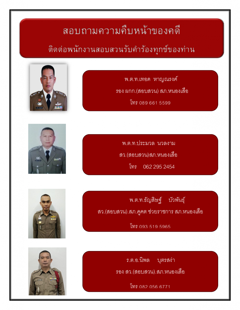 - ติดตั้งป้ายประชาสัมพันธ์ให้ประชาชนทราบเพื่อสอบถามความคืบหน้าการดำเนินคดีโดยมีรายชื่อ พนักงานสอบสวนที่จะติดต่อพร้อมเบอร์โทรศัพท์